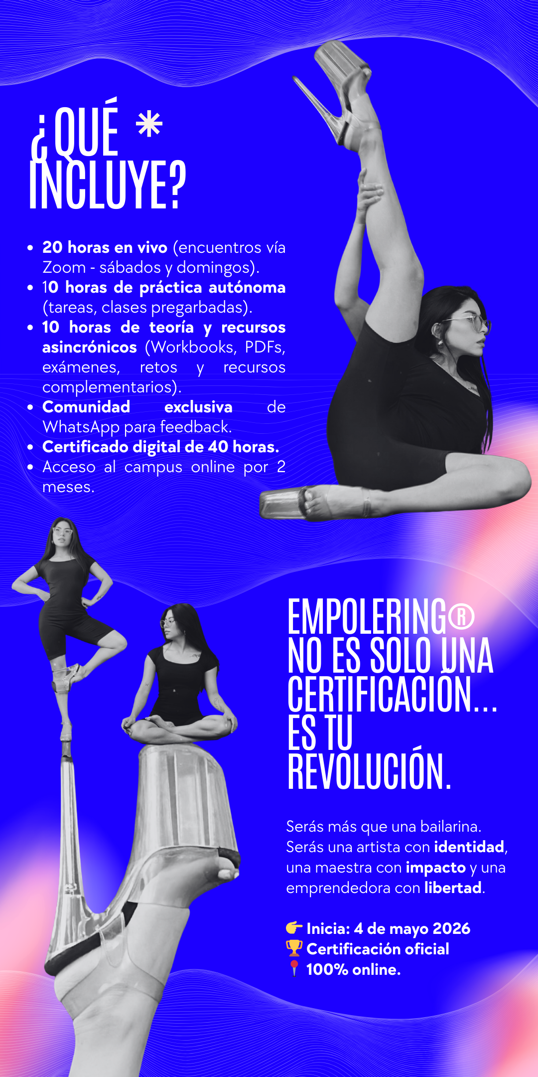 Certifícate como entrenadora y artista de Exotic Pole en 6 semanas 🌹💋 Inicia 4 de mayo 2026 - clases en vivo + plataforma con materiales, tareas y exámenes semanales. Aprende basework, edgework, floorwork, performance, y domina la escena con conocimiento y elegancia. Ideal para bailarinas, instructoras y creadoras que quieren enseñar, fluir y vivir de su arte.